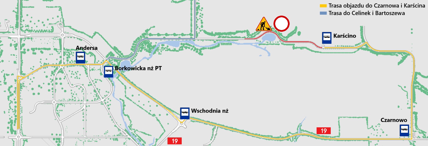 Od 4 sierpnia ropoczyna się remont fragmentu drogi powiatowej pomiędzy Borkowicami i Karścinem. Wykonawca robót od 11 sierpnia na co najmniej 4 miesiące wprowadzi tymczasową organizcję ruchu polegającą na całkowitym zamknięciu ww. drogi. W związku z tym wprowadzone zostaną zmiany w kursowaniu linii nr 29 w wariancie z/do Czarnowa:
